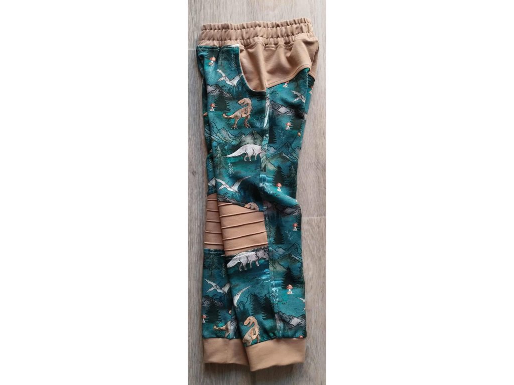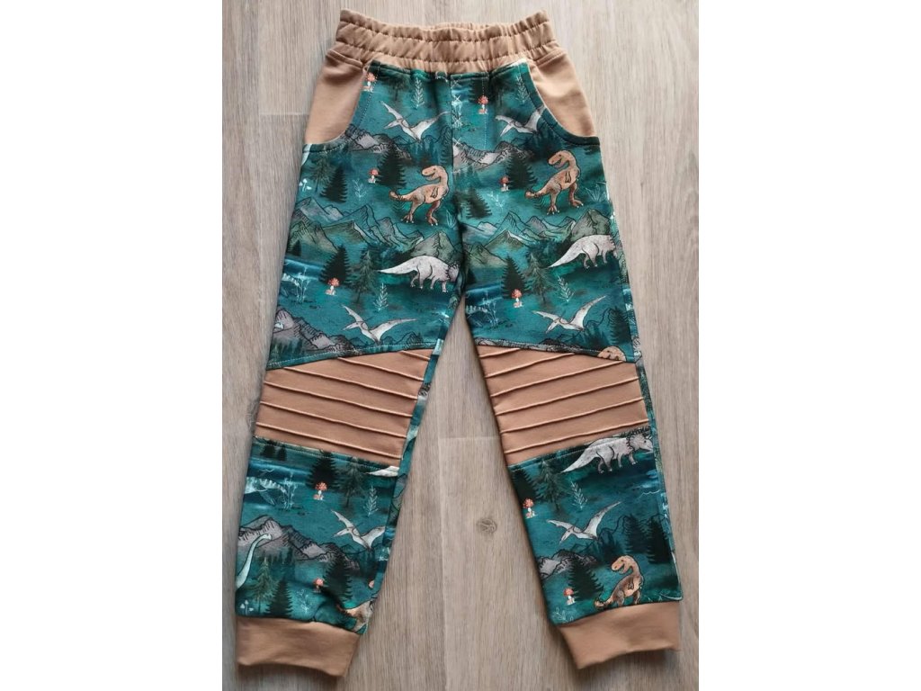 Tepláky z nepočesané teplákoviny , tepláky mají dvě kapsy ,v pase je guma. Kolena jsou prošívaná.