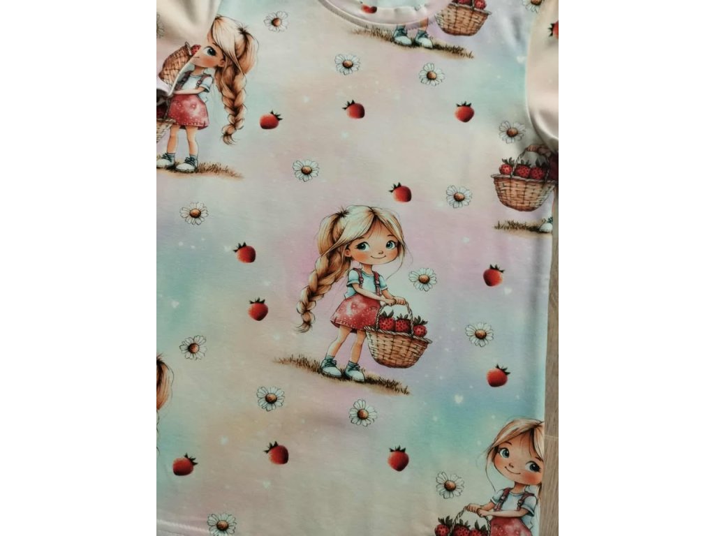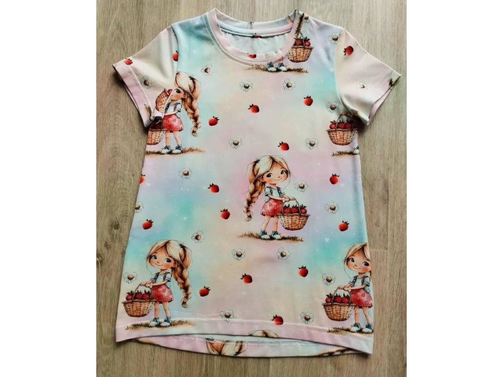 Úpletové tričko s holkou a jahodou ,materiál je příjemný na dotek a dobře se nosí .