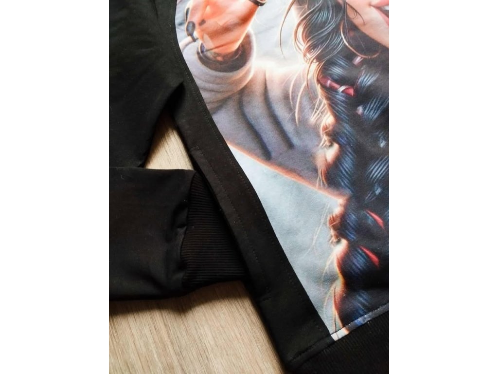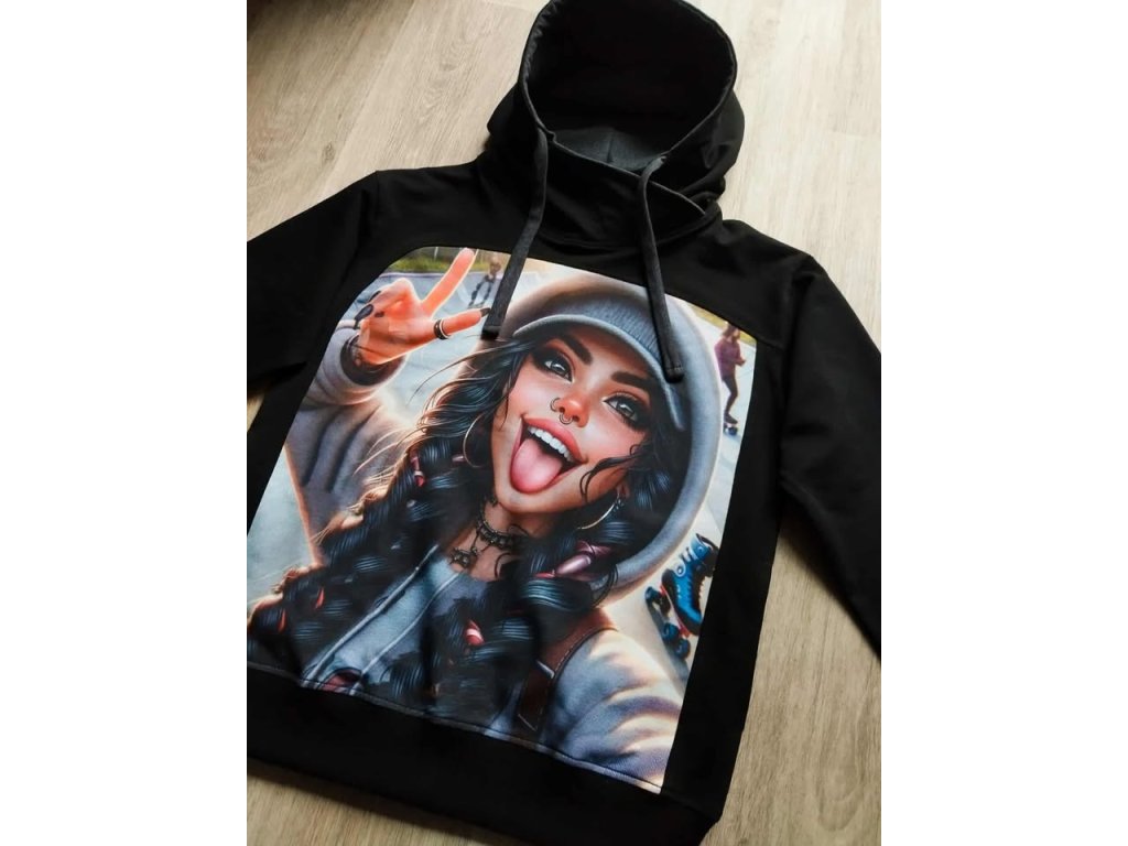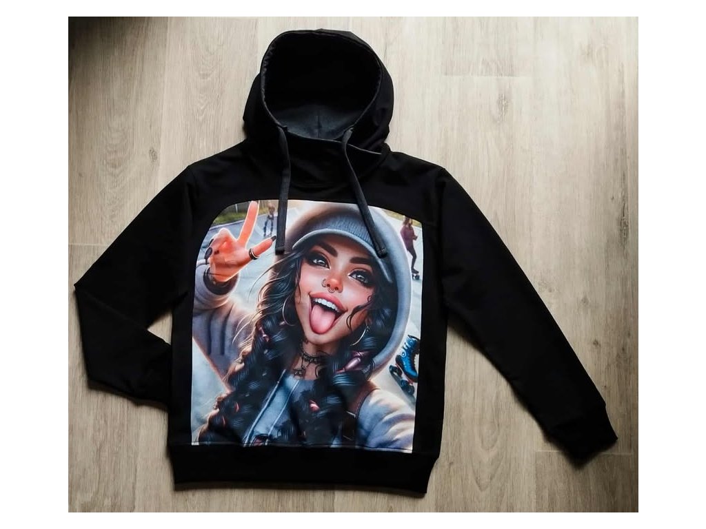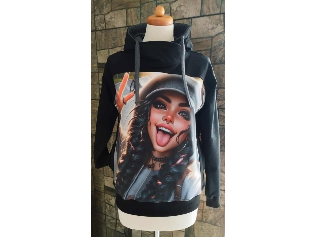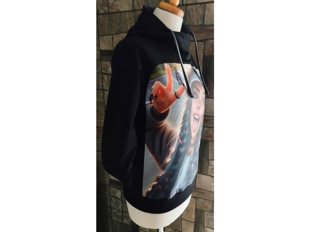 Tepláková mikina je z nepočesané teplákoviny . Kapuce je překřížená se šnůrkami. Mikina má kapsy v boku . Unosí ji i dámská velikost XS, S .Mikina má spadené rukávy.