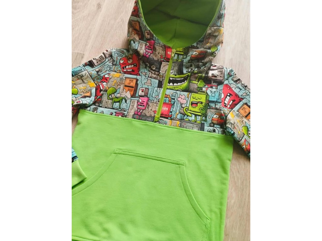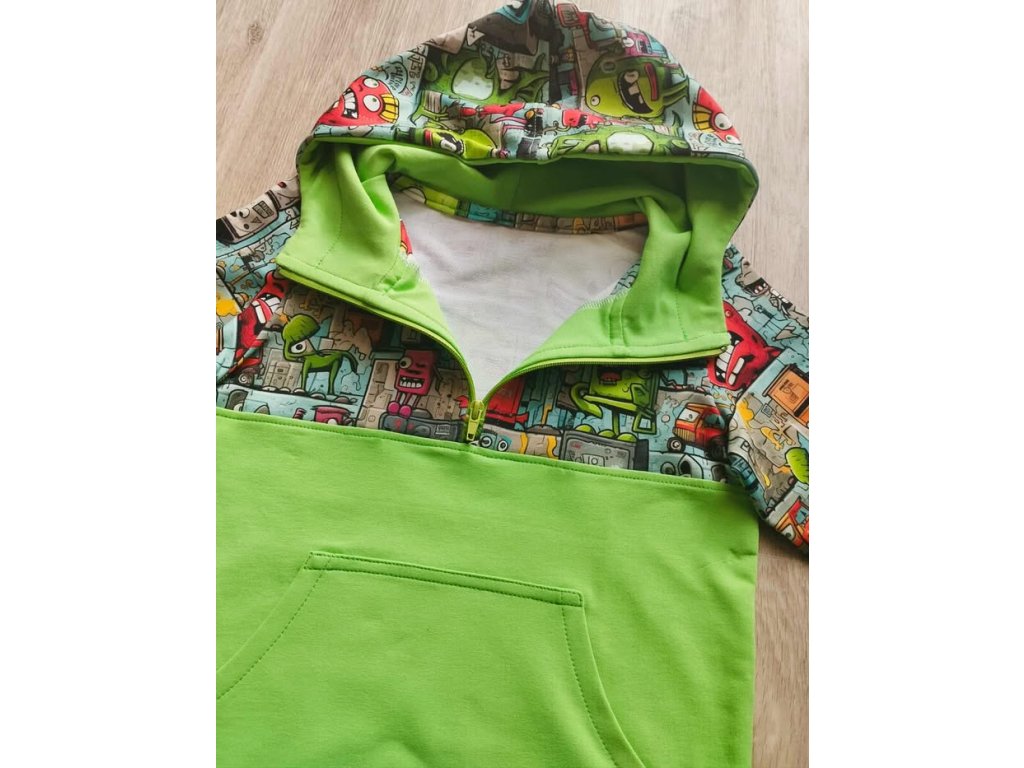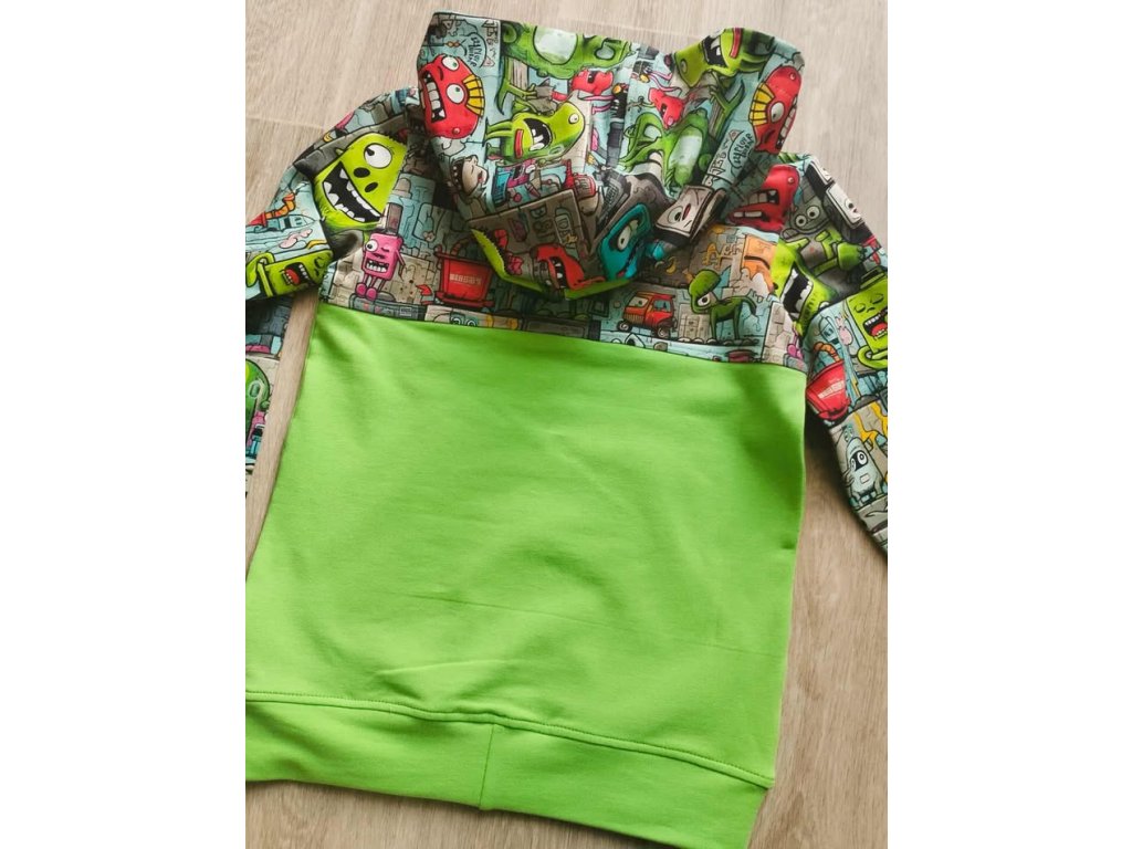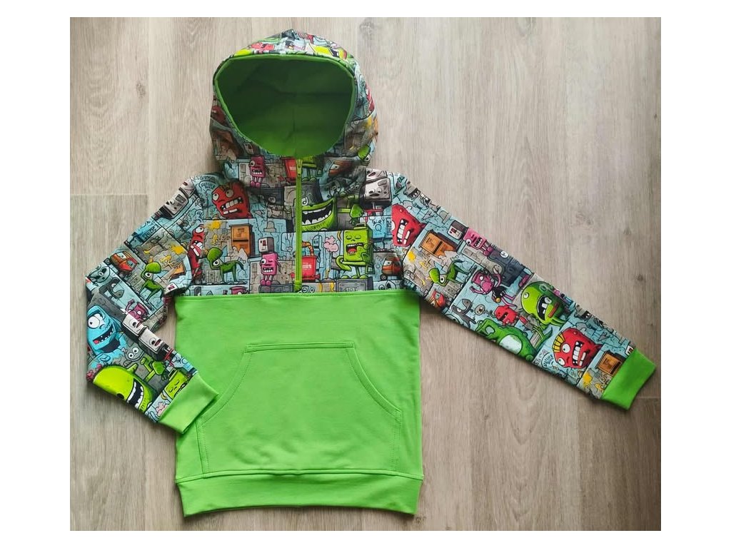Tepláková mikina je z nepočesané teplákoviny . Mikina má kapsu klokanku. Kapuce je vyvýšená se zipem .