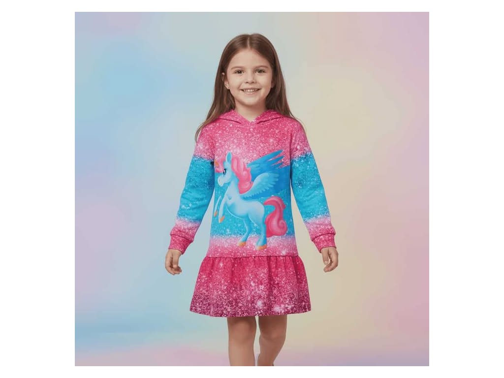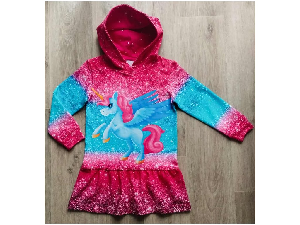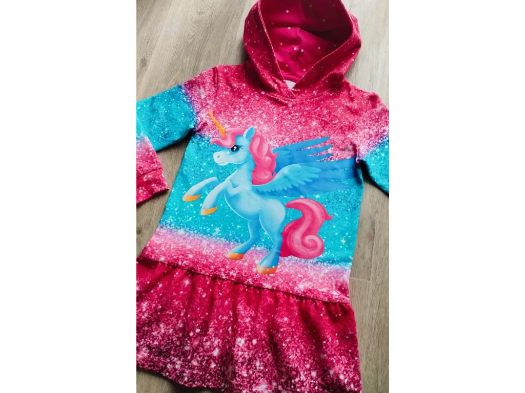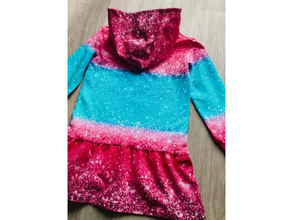 Teplákové mikinošaty je z nepočesané teplákoviny . Mikinošaty jsou bez kapes. Kapuce je překřížená od krku bez šnůrky .Obrázek na postavě je jen pro představu .