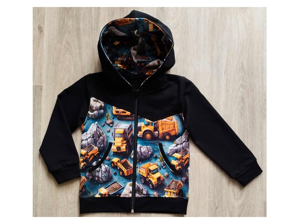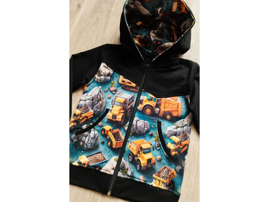 Tepláková mikina je z nepočesané teplákoviny<do kombinace s černou teplákovinou .Mikina má klokankové kapsy ,kapuce je od krku .