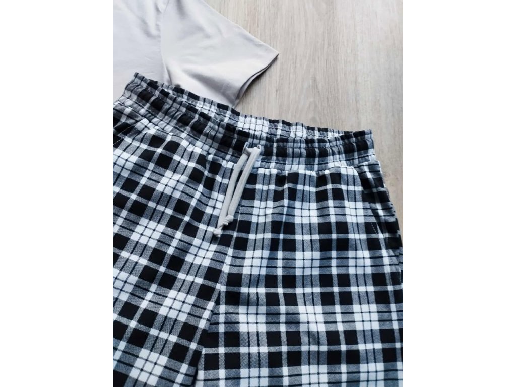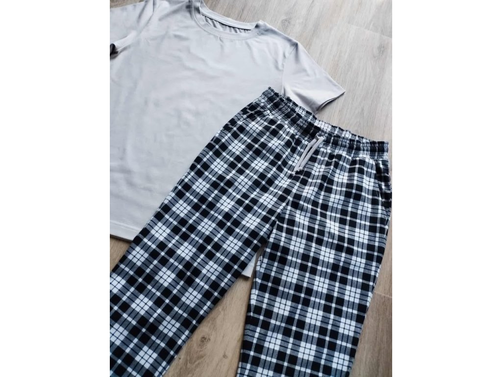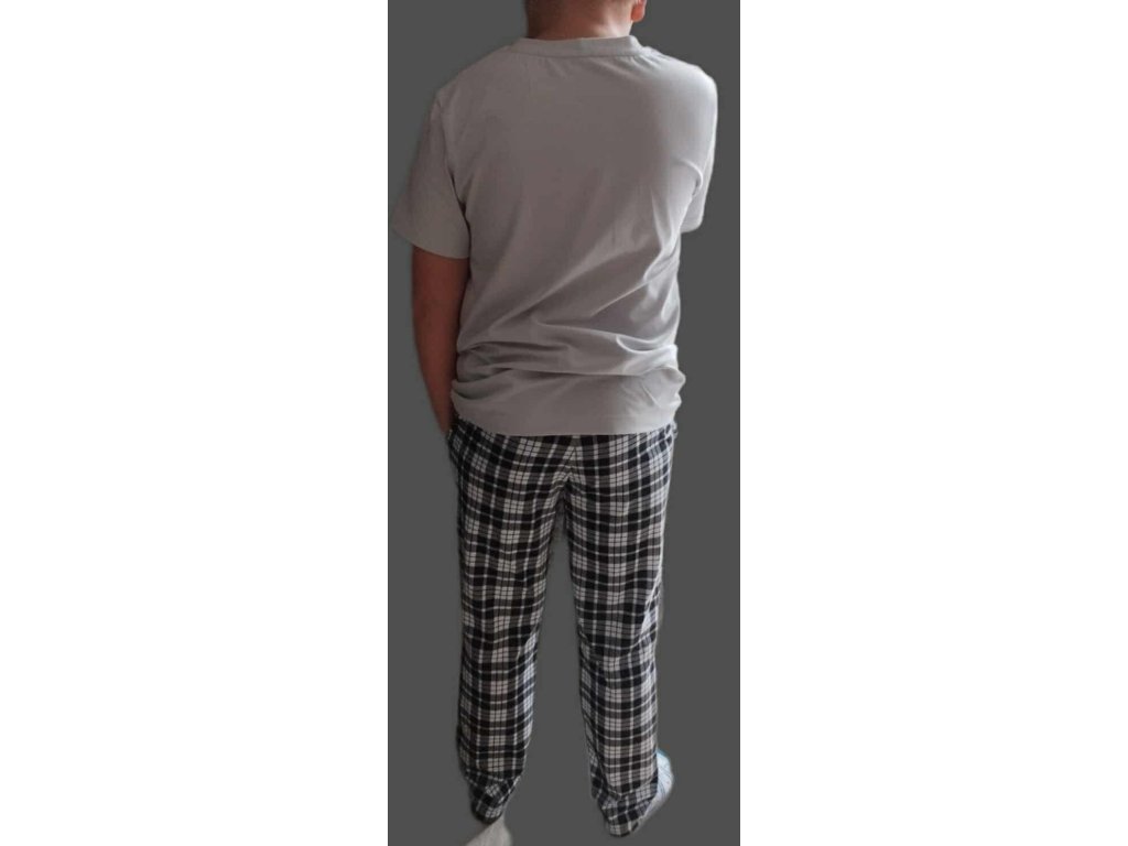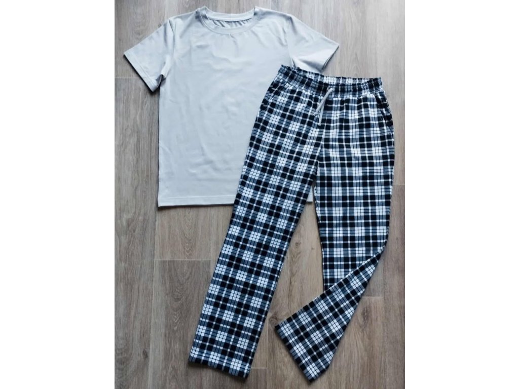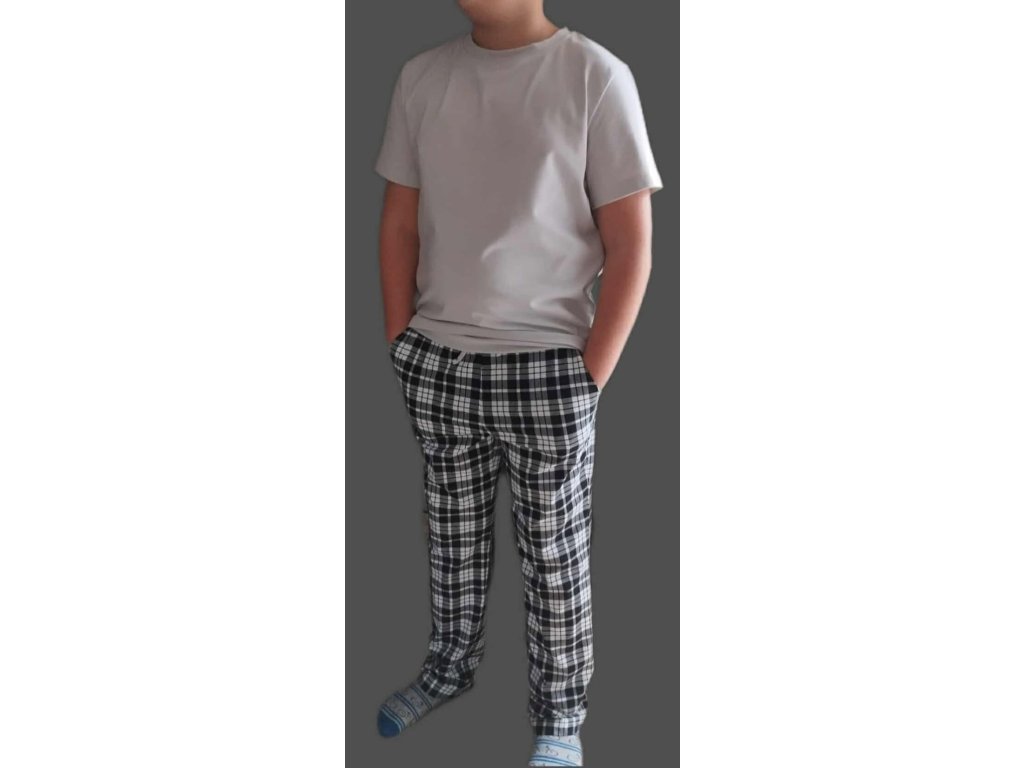 Úpletový komplet - tričko + kostkované kalgoty , kalhoty mají kapsy, pas je na stahování šnůrkou a gumou. Kostkované kalhoty jsou ze 100% bavlny ,ale i tak jsou pružné .