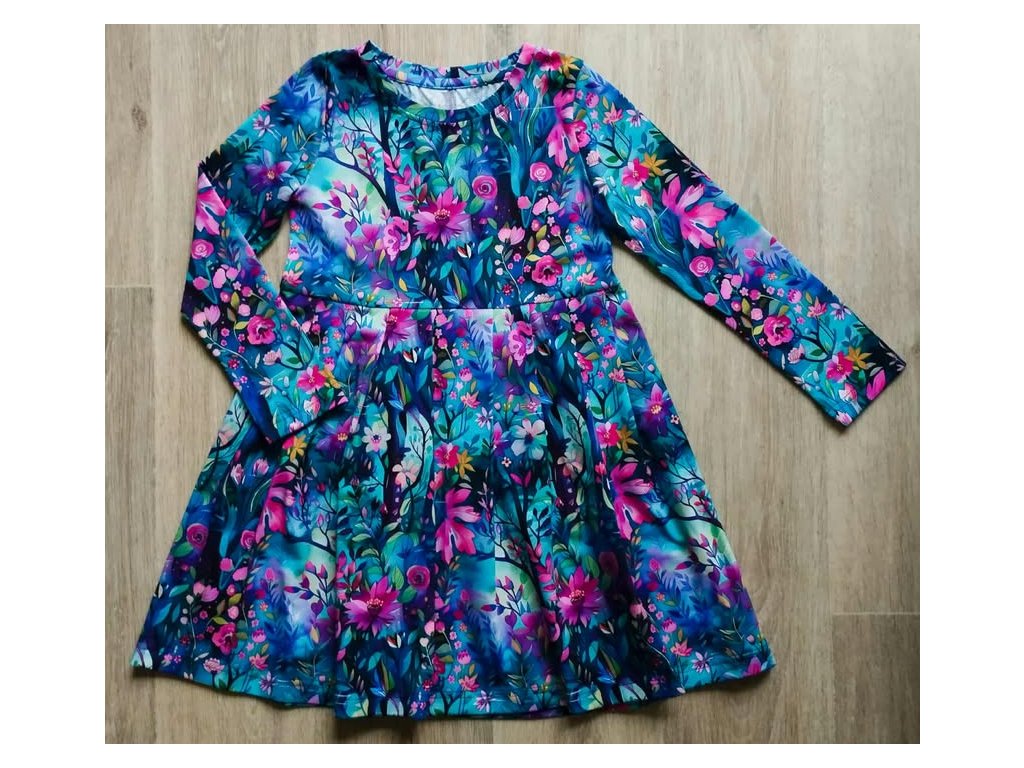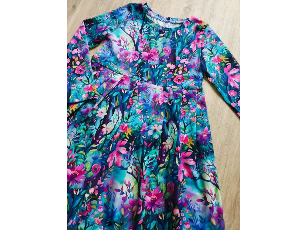 Úpletové šaty růžové květiny na modré s dlouhým rukávem.Obrázek na postavě je jen pro představu .