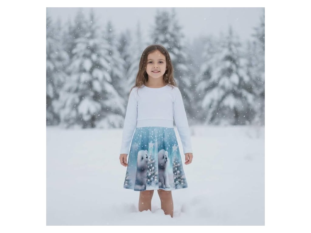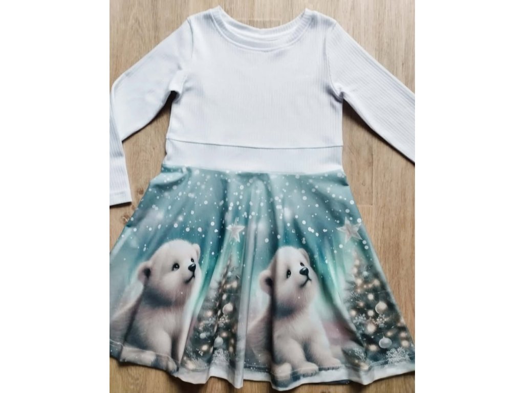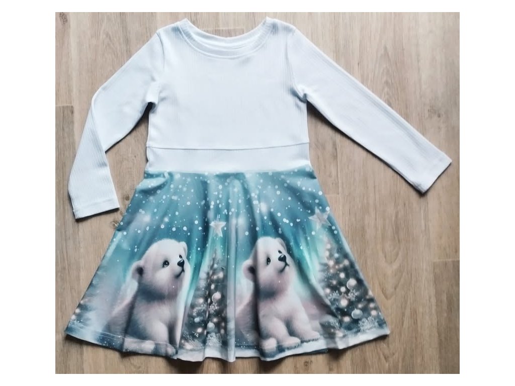 Úpletové šaty s dlouhým rukávem. Materiál vrchní části je bavlněný úplet s elastanem, žebrovaná struktura. Sukně je půlkolová a je z bavlněného úpletu. Barva vrchní části je bílá.