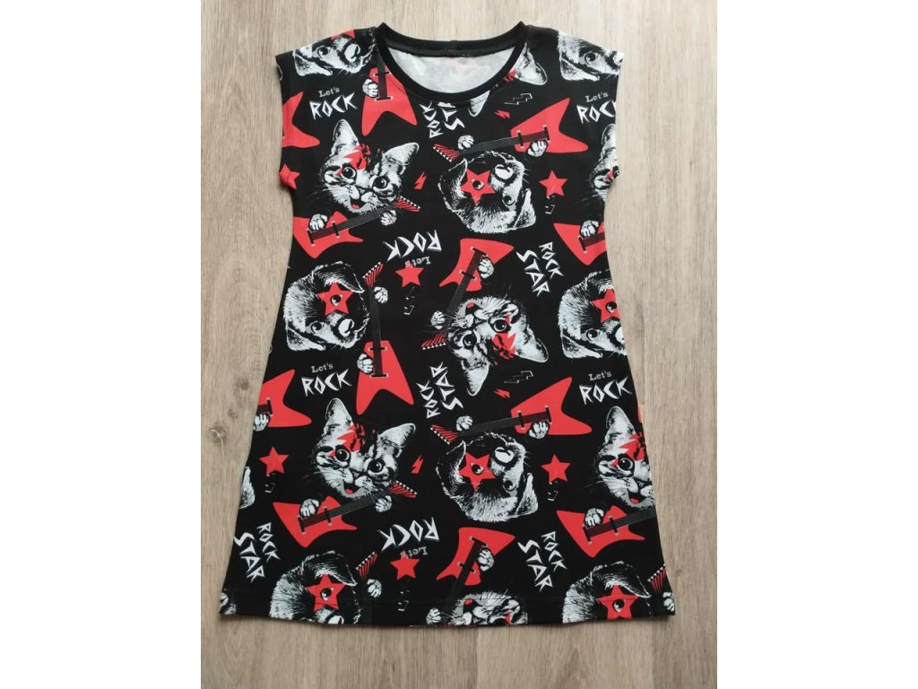Úpletové šaty rocková kočka a pes .Šaty mají přinechaný rukáv , jsou bez kapes .