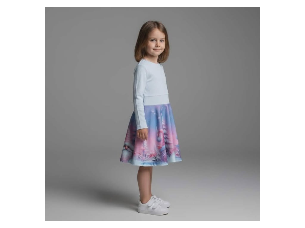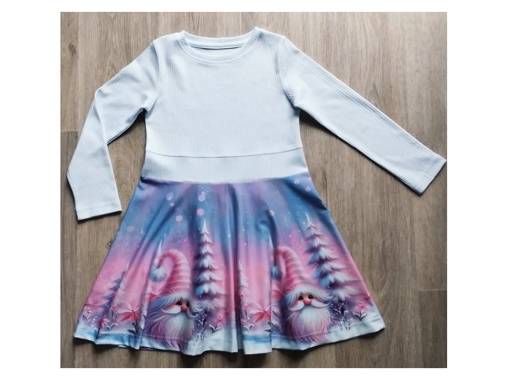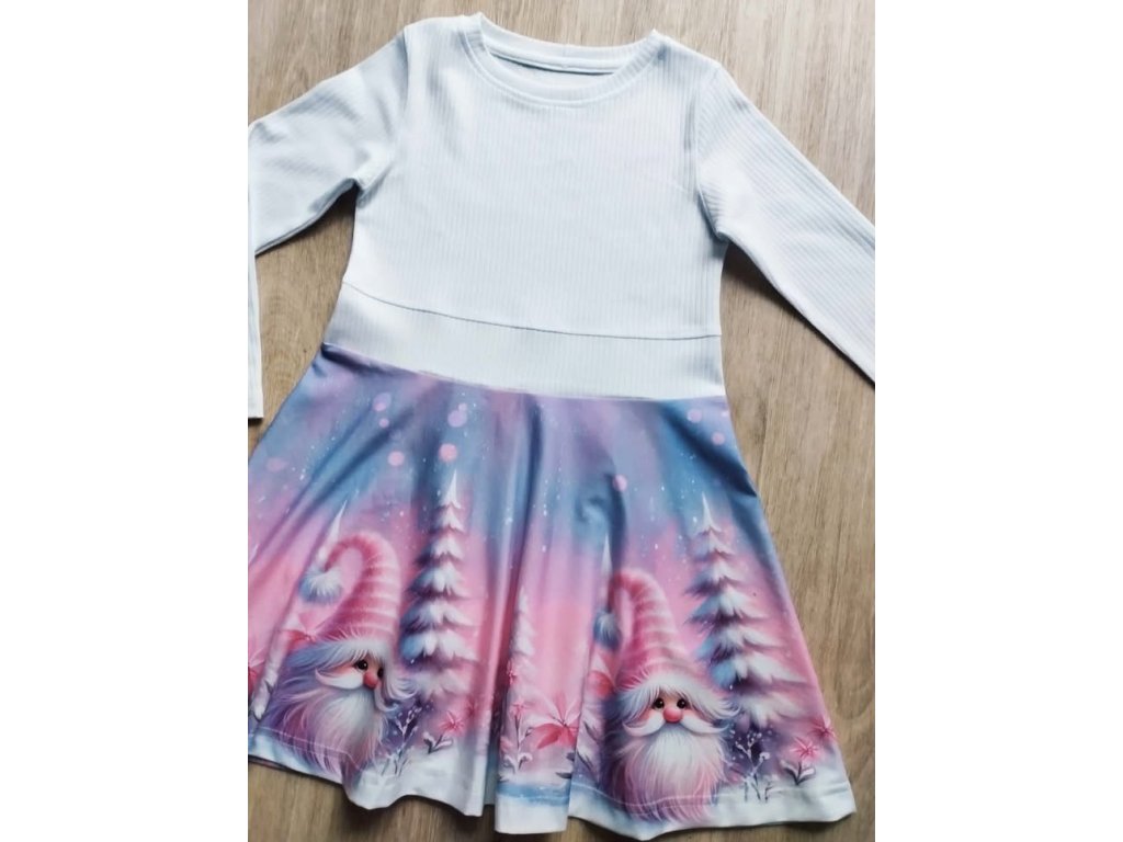 Úpletové šaty s dlouhým rukávem. Materiál vrchní části je bavlněný úplet s elastanem, žebrovaná struktura. Sukně je půlkolová a je z bavlněného úpletu. Barva vrchní části je bílá.